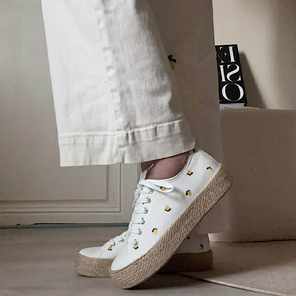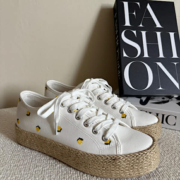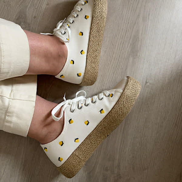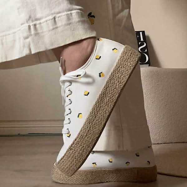 Apportez une touche de fraîcheur à vos tenues avec ces baskets à motifs citrons, au style estival. Leurs motifs brodés apportent une note originale et lumineuse, tandis que la semelle effet corde tressée leur donne un esprit naturel et tendance. Ces baskets allient style et légèreté pour un usage quotidien.