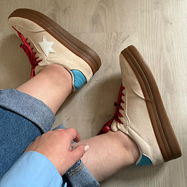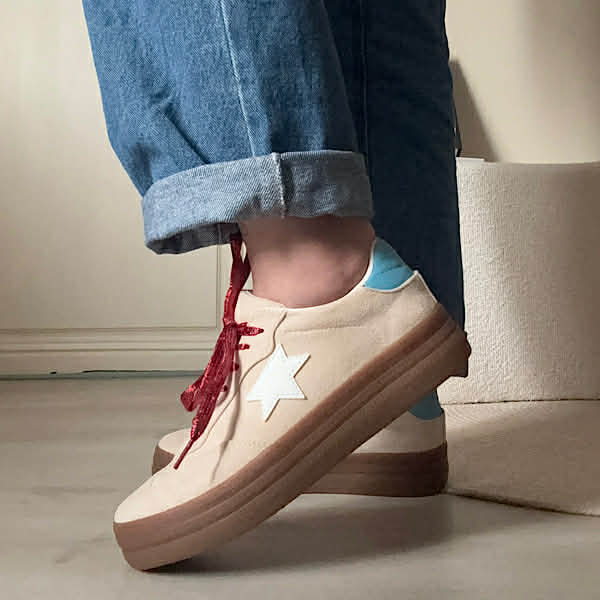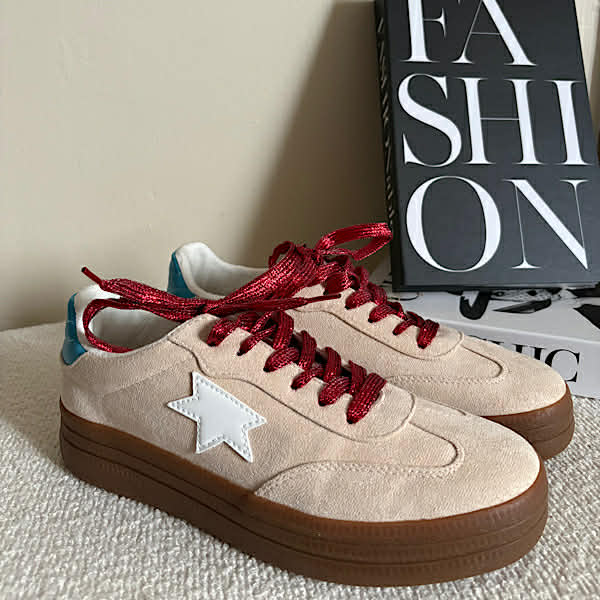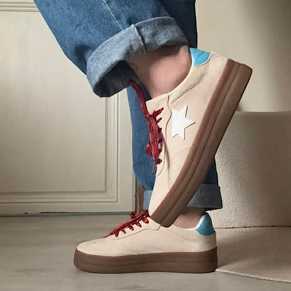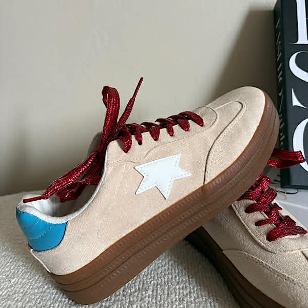 Craquez pour ces baskets beiges au design original, parfaites pour apporter une touche tendance à vos tenues. Leur étoile blanche sur le côté, associée aux lacets rouges brillants, apporte une note dynamique et moderne.