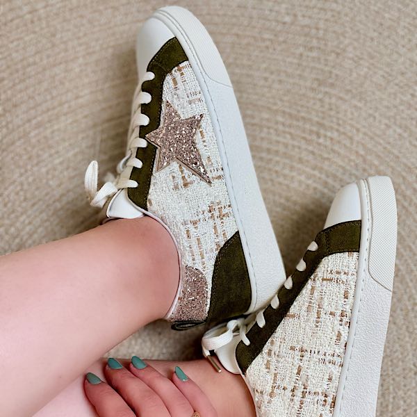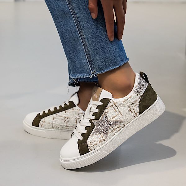Ces baskets tendance combinent confort et originalité avec une touche d’élégance. Elles se distinguent par une texture tissée raffinée à domination blanche, réhaussée par une étoile pailletée rose doré sur les côtés extérieurs, apportant une note de glamour. Les empiècements en suédine kaki ajoutent une touche de caractère. Ces chaussures sont parfaites pour celles qui recherchent un style chic et décontracté, alliant modernité et détails sophistiqués.
