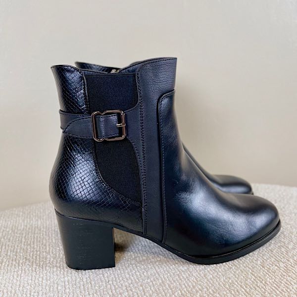 Ces bottines noires allient élégance et modernité avec un design raffiné. Confectionnées en simili cuir lisse, elles se démarquent par leurs détails en relief façon peau de serpent à l’arrière, ajoutant une touche sophistiquée. La boucle métallique sur le côté renforce leur allure chic. Le talon carré de taille moyenne offre une excellente stabilité, parfait pour un usage quotidien sans compromettre le style. Idéales pour sublimer une tenue de bureau ou un look plus décontracté, ces bottines sont un incontournables de la garde-robe.