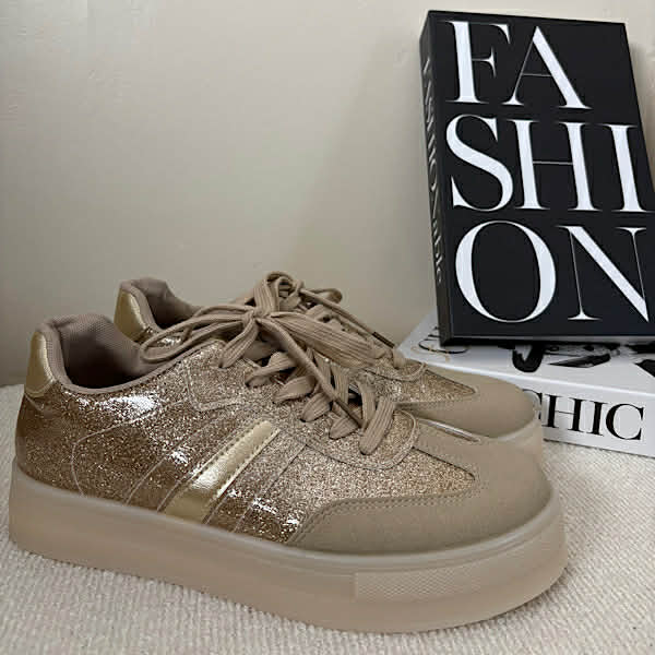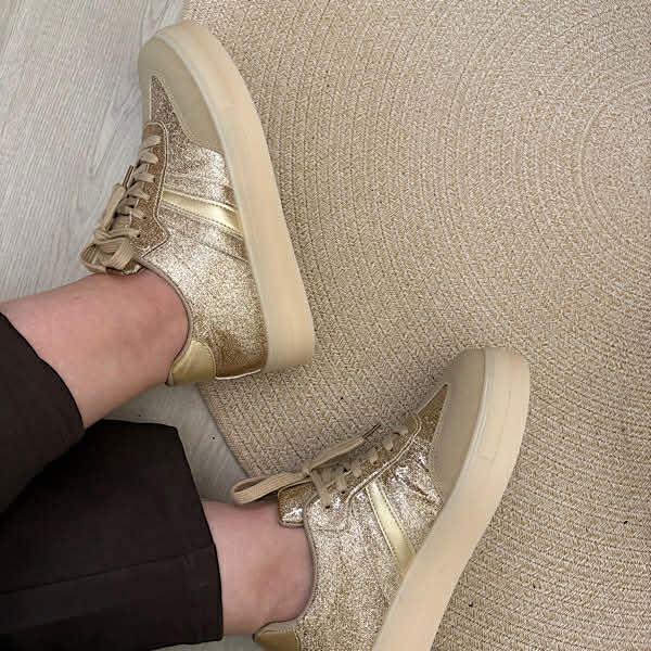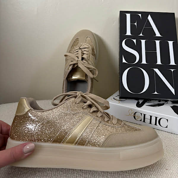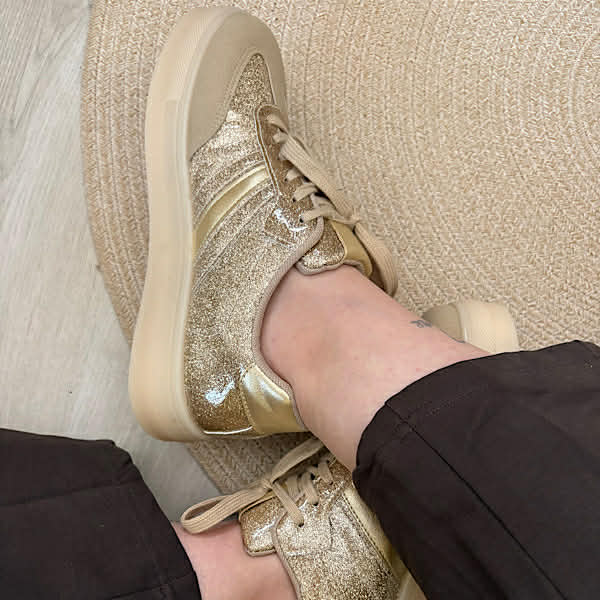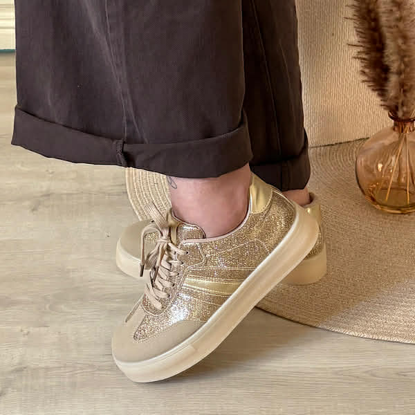 Apportez une touche lumineuse à vos tenues avec ces baskets dorées pailletées, parfaites pour allier confort et style. Leur matière pailletée dorée attire subtilement la lumière et donne à cette paire un look chic et féminin. Les empiècements beige doux et les bandes dorées créent un contraste élégant et moderne. Montées sur une semelle épaisse et confortable, ces baskets offrent un excellent maintien et sont idéales pour accompagner vos journées avec style.
