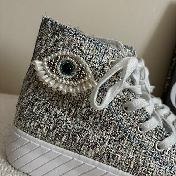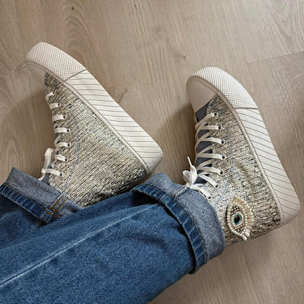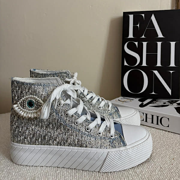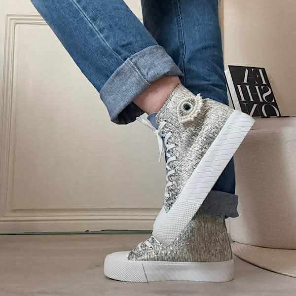 Craquez pour ces baskets montantes au design original et tendance. Leur matière apporte une touche chic et lumineuse, tandis que le détail oeil en perles et strass donne à ce modèle une vraie personnalité. Montées sur une semelle épaisse et confortable, ces baskets offrent un bon maintien grâce à leur forme montante et sont idéales pour un usage quotidien. Faciles à associer, elles se portent parfaitement avec un jean, un pantalon ou une tenue décontractée pour un look moderne et stylé.